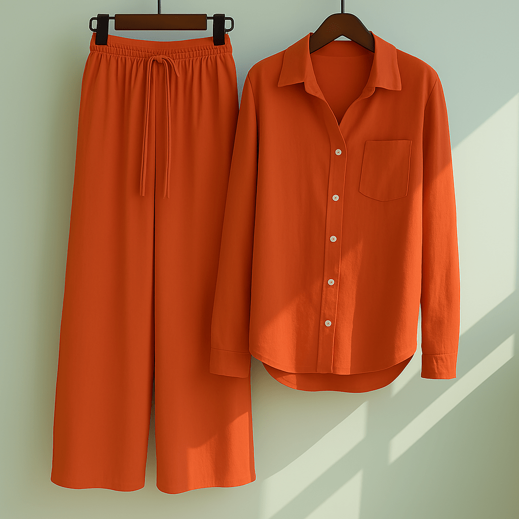Verfijnd ontwerp: Chemise met lange mouwen en knopen, en een wijdvallende broek voor een chique look.